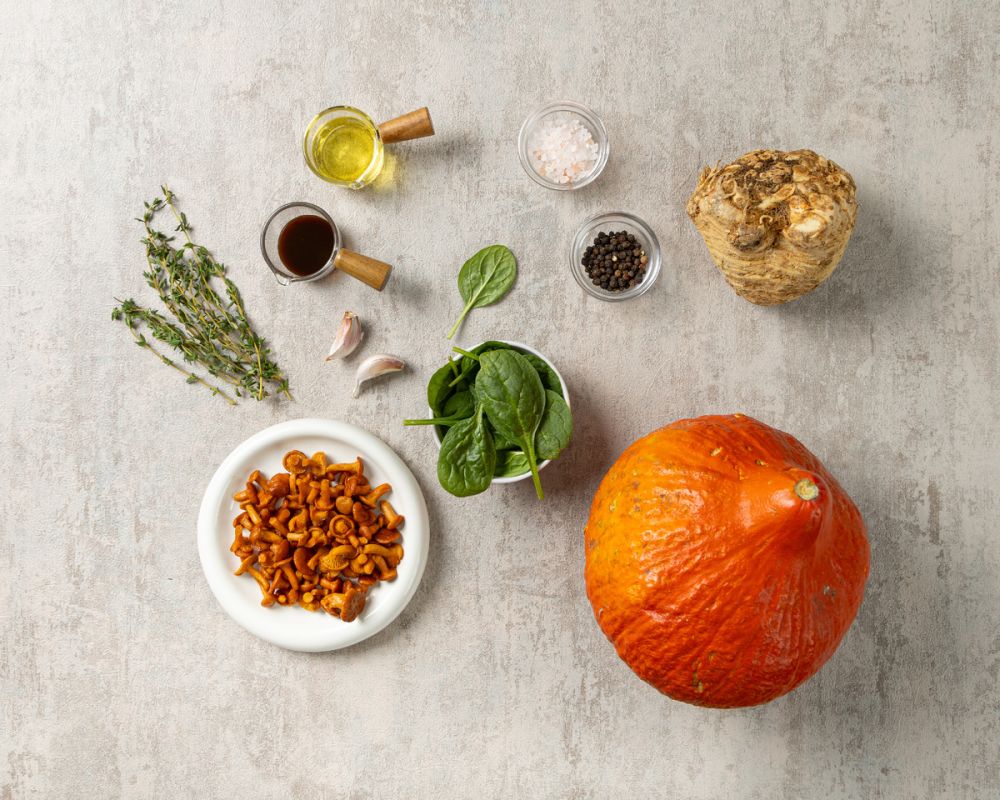 Основа блюда проста: две мини-тыквы подготовить как крышечки, удалить семена и смазать маслом. Внутрь добавить веточку тимьяна и запечь до мягкости. Начинка — кубики пастернака, сельдерея, белых грибов и лисичек, обжаренные с тимьяном и лёгким чесночным акцентом; шпинат добавляется в конце для яркости цвета и текстуры. Все ингредиенты держать ? al dente, чтобы сохраниться форма и характер каждого продукта.