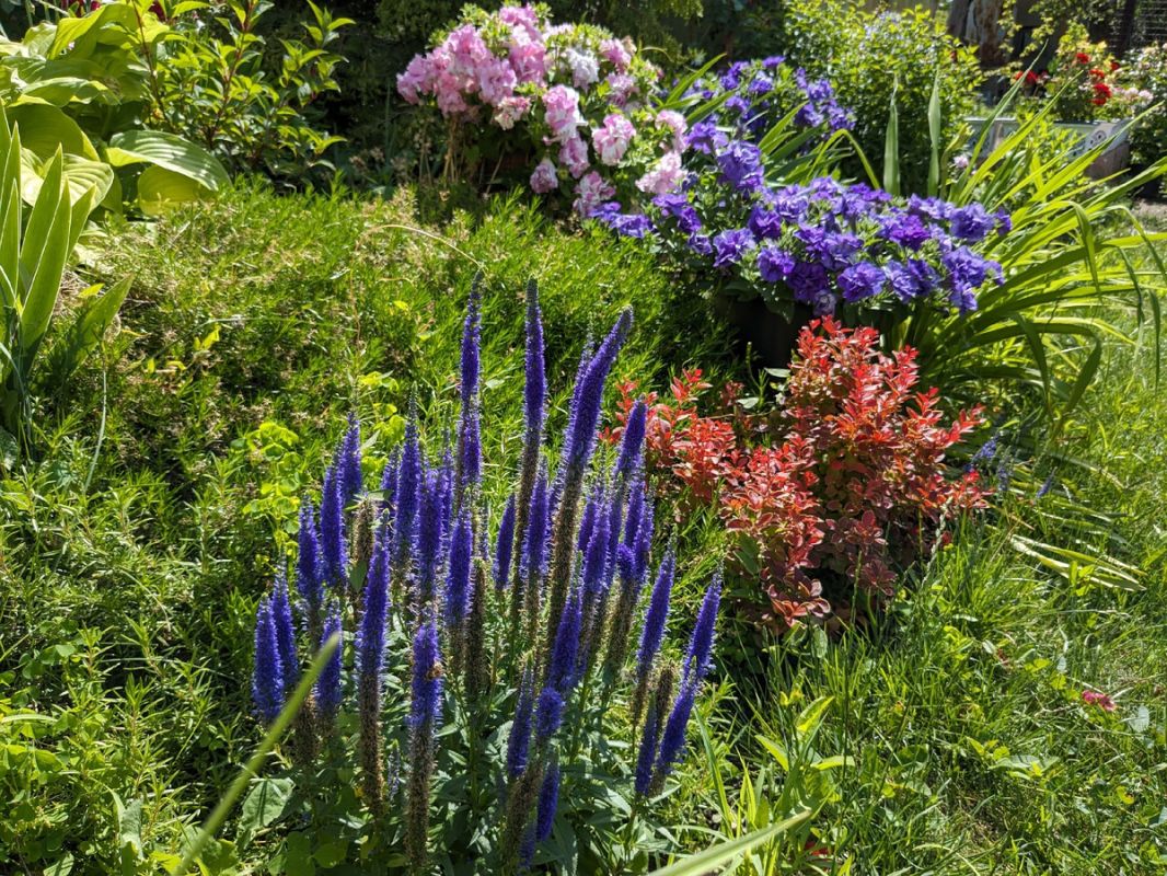 Планируя свои посадки, садоводы могут использовать различные тактики. Например, в прошлом сезоне освежили один из цветников, добавив дополнительные горшки с петуниями, что помогло скрыть отцветающие флоксы и ирисы. Теперь же, к этому удачному приему добавилась и вероника, которая возникла совершенно неожиданно.