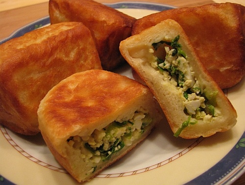 Начинка состоит из сваренных вкрутую яиц и зеленого лука, обжаренного в небольшом количестве масла или поданных сырыми. Соус здесь не нужен: соль и свежесть зелени завершают вкус.