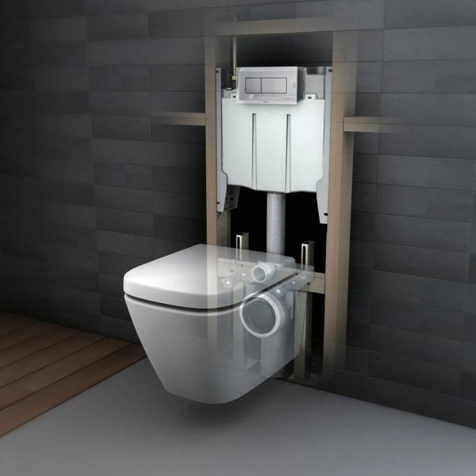 Навесная инсталляция, также известная как блочная, представляет собой прямоугольный металлический каркас, устанавливаемый к стене с помощью анкерных болтов и дополнительных крепежных элементов. Этот тип конструкции часто полностью встраивается в стену, что позволяет сохранить пространство в ванной. Однако за компактностью скрываются некоторые риски: такие инсталляции могут быть установлены только на капитальные стены, иначе они не выдержат нагрузки.