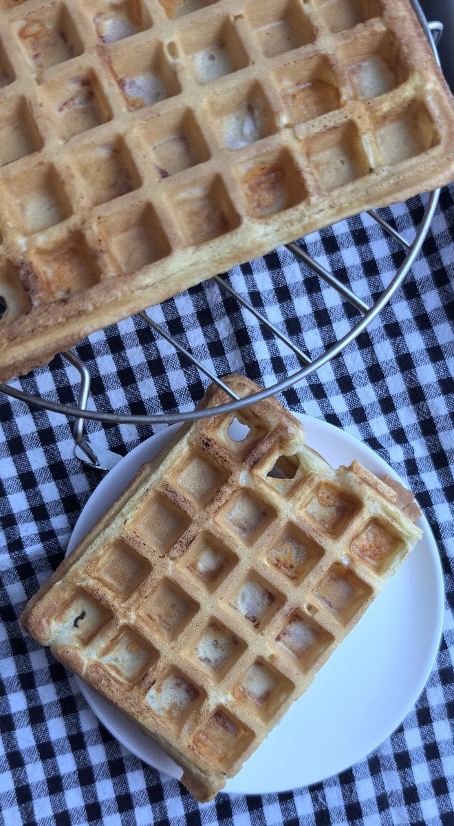 3. Готовка вафель: Разогрейте вафельницу и вылейте порцию теста (рекомендуется готовить две большие вафли). Закройте и готовьте 3-4 минуты до появления золотистой хрустящей корочки.