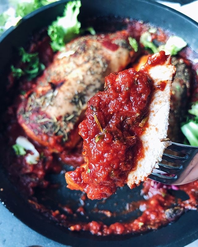 Выложите подготовленные грудки в форму для запекания и залейте их рубленными томатами. Дополните всё смесью специй: базиликом, орегано, шалфеем и тимьяном. Разогрейте духовку до 180°C и запекайте блюдо в течение 30-40 минут.