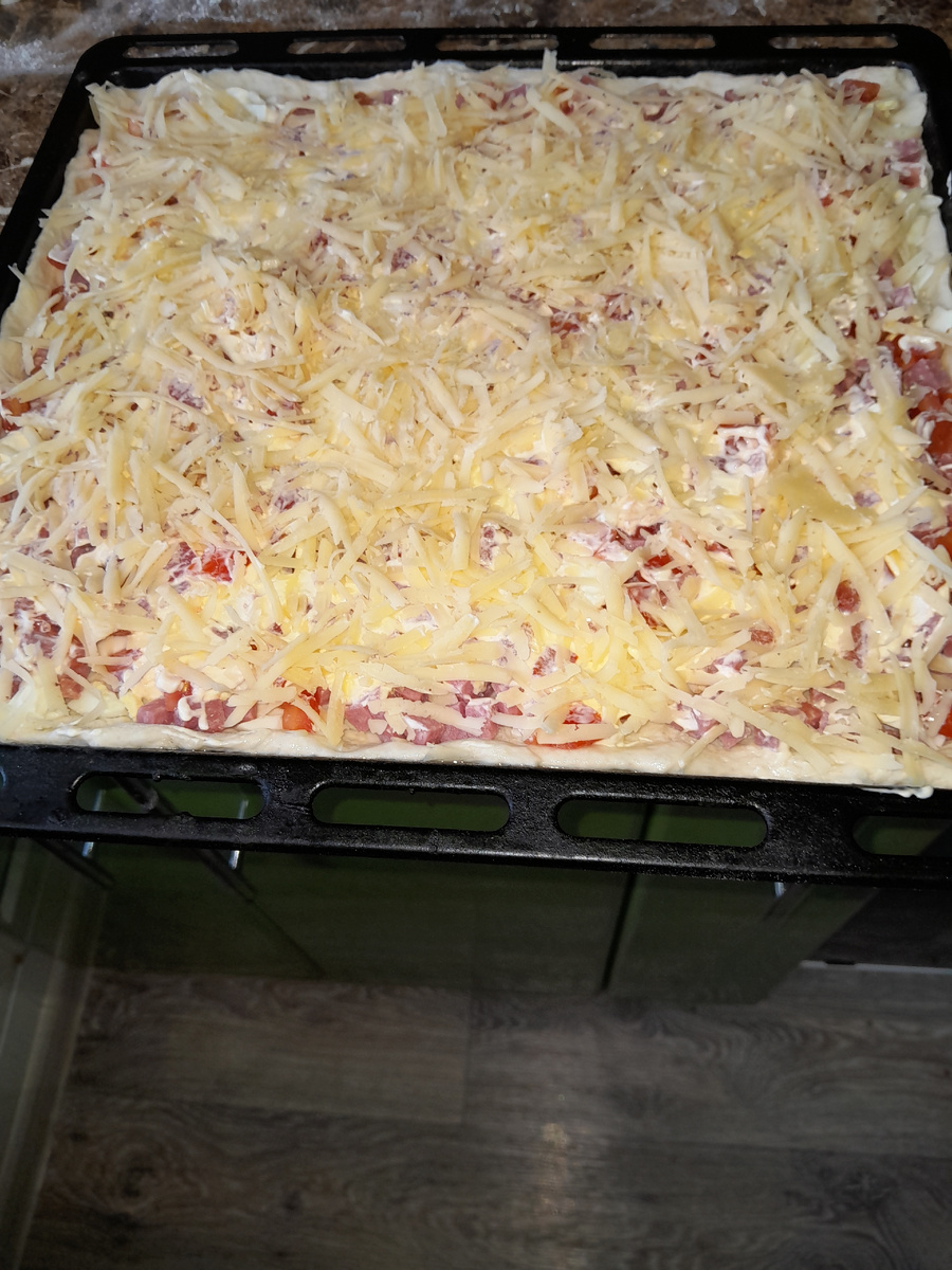 Приготовленная пицца выпекается на противне или пицца-камне при температуре 220–250°C в течение 8–12 минут до золотистого цвета.