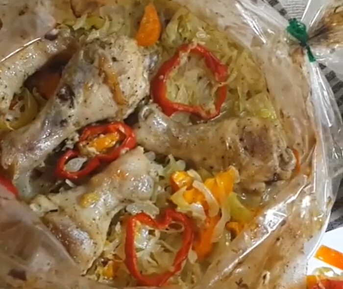 3. Заполняем рукав для запекания капустной смесью, разравниваем, а сверху выкладываем маринованные куриные ножки. Закрываем рукав с двух сторон, делаем несколько небольших надрезов для выхода пара и ставим в заранее разогретую до 200°C духовку на 40 минут.