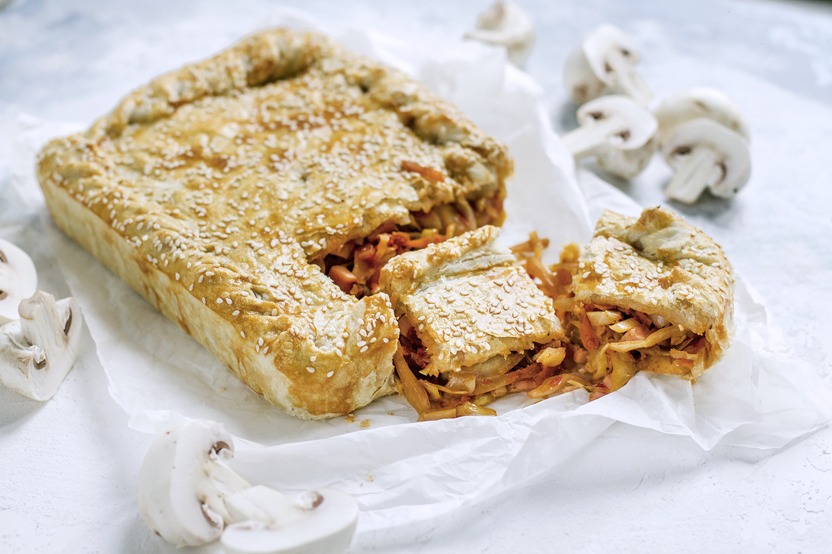 Этот восхитительный пирог из слоёного теста с начинкой из индейки, капусты и ароматных специй Хмели Сунели станет настоящим угощением для каждого. Приготовить слоёное тесто можно даже дома, но секрет его успеха заключается в правильном раскатывании. Чем больше раз вы раскатаете тесто, тем больше слоёв получится. Важно не выходить за края теста и раскатывать его в одном направлении, чтобы сохранить слоистую структуру.