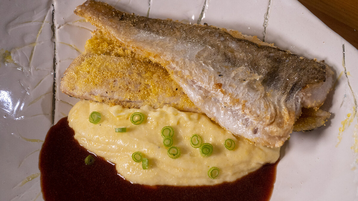 Для гарнира в кастрюлю кипятка постепенно добавляют кукурузную манку, взбивая венчиком, чтобы избежать комков. Затем добавляют сливки и дают загустеть. В конце вводят тертый сыр сулугуни и приправляют солью. На подачу выставляют тарелку с кукурузной кашей, рыбой и поливают соусом, украшают натертой тыквой и зелёным луком.