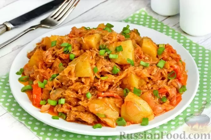 - Капустное рагу с картошкой и тушенкой. Это блюдо станет настоящим спасением в будний день. Оно сочетает в себе хрустящую свежесть капусты и насыщенный вкус мяса из банки. Сделать его можно буквально за полчаса, что идеально подходит для занятых хозяек.