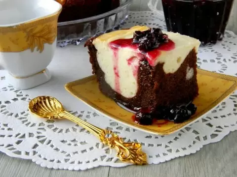 4. Творожную массу аккуратно выложить поверх шоколадного слоя.