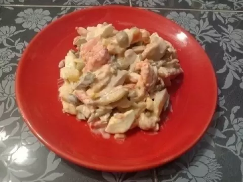 Готовый салат щедро заправляют майонезом и выкладывают горкой в красивую салатницу. Идея праздника с салатом «Оливье» из перепелок и раковых шейков станет ярким акцентом новогоднего стола, а ваши родные и близкие останутся довольны таким угощением. Праздник невозможно представить без неожиданных гастрономических решений, и этот салат точно оправдает ваши ожидания!