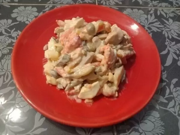 После того как все ингредиенты будут готовы, овощи очищаем и нарезаем кубиками. Огурцы можно порезать соломкой. В глубокой миске смешиваются все продукты: нарезанные овощи, зелень, горошек, каперсы и раковые шейки. Не забудьте приправить смесь солью и перцем по вкусу!