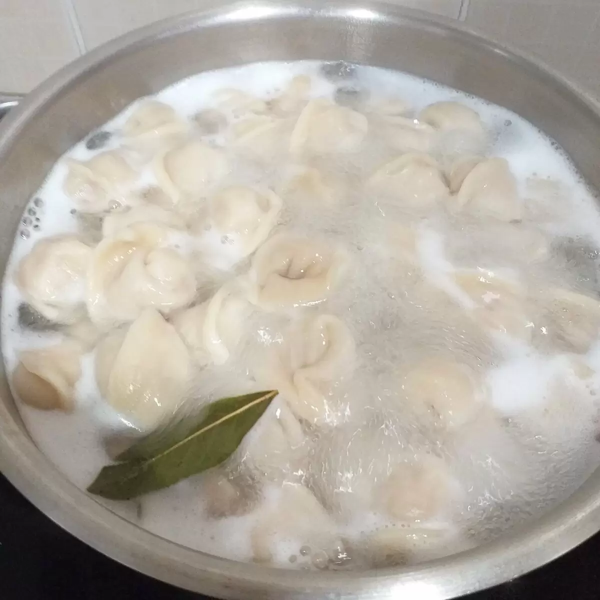 Сначала пельмени отвариваются в подсоленной воде с добавлением лаврового листа. Важно обратить внимание на время варки: необходимо отварить их на 2 минуты меньше, чем указано на упаковке, или, если используются домашние пельмени, варить 3 минуты после закипания.