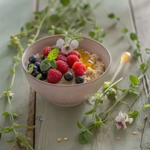 - Овсянка с лесными ягодами и орехами: Каша, которая украсит ваш завтрак — сочная малина и черника в сочетании с хрустящим миндалем сделают утро ярче.