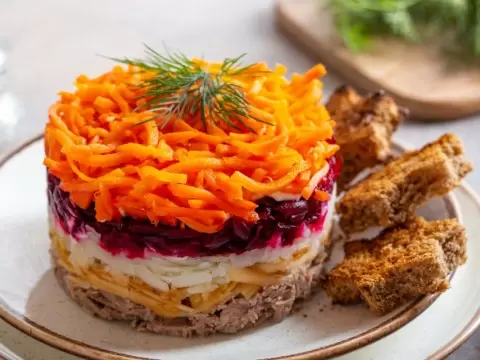 Это не просто салат, а настоящая кулинарная находка! Разнообразие ингредиентов прекрасно дополняют друг друга, а аккуратная подача просто не оставит равнодушными никого. Кроме того, слои салата отлично пропитываются, но не теряют своей формы. А хлебные звездочки, которые добавляются в качестве украшения, становятся идеальным завершением. Гости были в полном восторге от подачи!