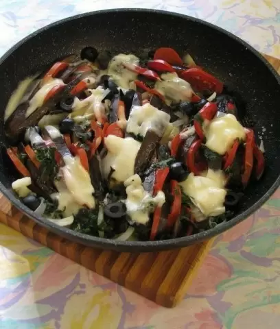 Подготовленные баклажаны укладываются на сковороду, смазанную растительным маслом. Промежутки между ними заполняются мелко нарезанными маслинами, луком, петрушкой и чесноком.