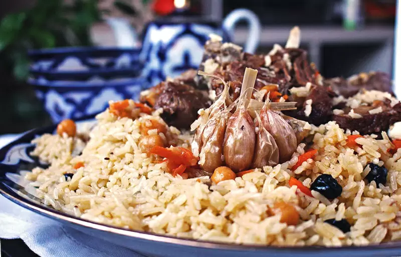 - Узбекский плов — краса и гордость Узбекистана. Готовится в казане на открытом огне с длиннозерным рисом, бараниной или говядиной. Основные ингредиенты включают морковь, лук и зиру. Главное правило — не мешать во время приготовления.