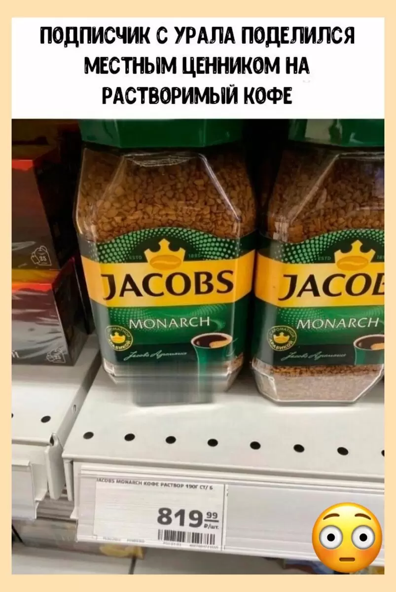 Взять, к примеру, растворимый кофе Jacobs Monarch. Сейчас его цена на полке магазина может достигать 820 рублей за банку в 190 граммов. Это означает, что 1 килограмм этого кофе обойдется в целых 4315 рублей! В магазине "Окей" сейчас он стоит 429 рублей по акции (в обычное время — 929 рублей). В "Магните" такая же продукция продается все за 860 рублей. Даже на маркетплейсе "Озон" его цена составляет 721 рубль. Как объяснить это резкое подорожание?