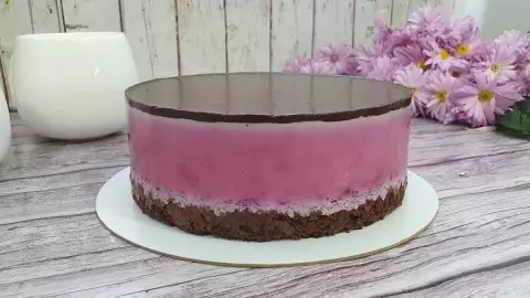 Для шоколадного слоя желатин следует также замочить и подготовить. В теплое молоко добавить какао и подсластитель, тщательно перемешать, чтобы избежать комков. Все соединить с желатином и вылить поверх застывшего мусса. Десерт убирают в холодильник минимум на 4 часа. После этого остаётся лишь аккуратно снять кольцо и ацетатную пленку, нарезать торт на порции и наслаждаться вкусом!