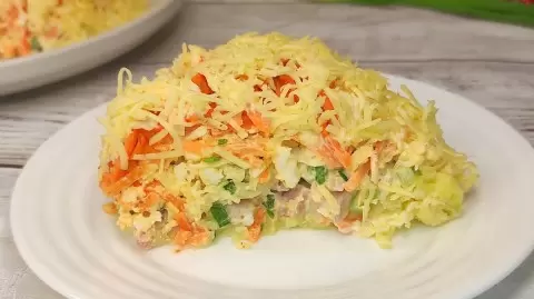 5. Затем выкладываются нарезанный зеленый лук и снова слой майонеза. Далее идут яйца, морковь по-корейски, которые также покрываются майонезом, а завершает композицию натертый сыр. Слой с сыром не нужно смазывать майонезом.