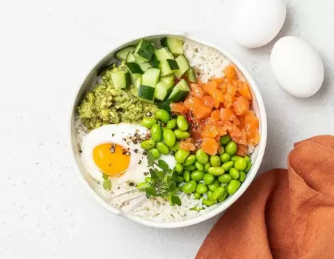 Лосось богат омега-3 жирными кислотами, которые полезны для сердца, а рис содержит сложные углеводы, обеспечивающие энергией. Авокадо добавляет полезные жиры и витамины, в то время как свежие овощи насыщают блюдо клетчаткой и антиоксидантами. Боул с лососем и рисом — отличное решение для тех, кто ценит вкусную и питательную еду, не теряя при этом время на сложные рецепты.