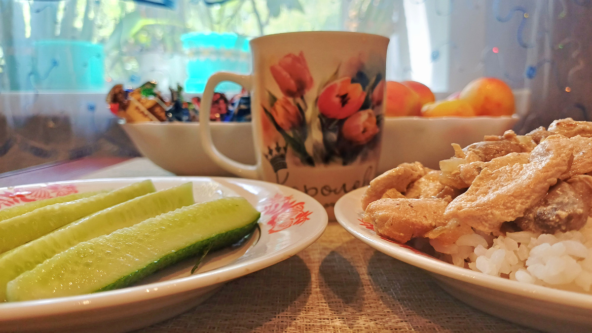 Такой обед не только порадует глаз, но и насытит. Сочетание курицы с грибами в соусе и вкусного гарнира дополнит ваш день хорошими эмоциями и приятными ощущениями от вкусового наслаждения.