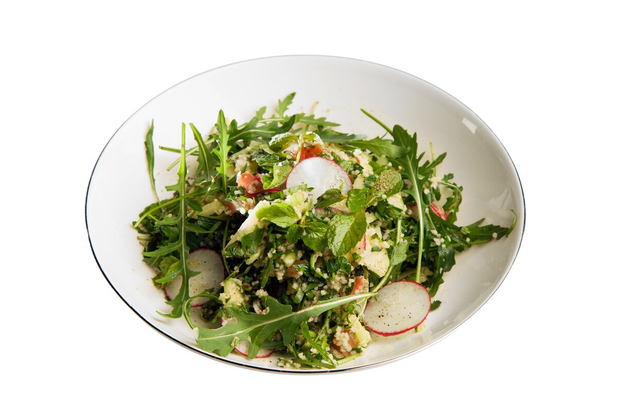 В миске залить кускус горячей водой в пропорции 1:2 и накрыть крышкой, оставив на несколько минут для запаривания.Огурцы очистить и нарезать полукольцами. Розовые помидоры избавить от семян и нарезать брусками. Редис нарезать тонкими полукольцами.Мелко нарезать петрушку и мяту.В отдельной посуде смешать сок половинки лимона с соком лайма, добавить зиру, коричневый сахар, соль и перец. Тщательно перемешать.В глубокой миске объединить кускус, подготовленные овощи, нарезанную зелень и листья рукколы. Заправить полученной смесью и аккуратно перемешать.Этот свежий и яркий салат прекрасно подойдет для легкого обеда или как гарнир к основным блюдам. Он не только вкусен, но и красив на вид, наполняя стол солнечными красками.
