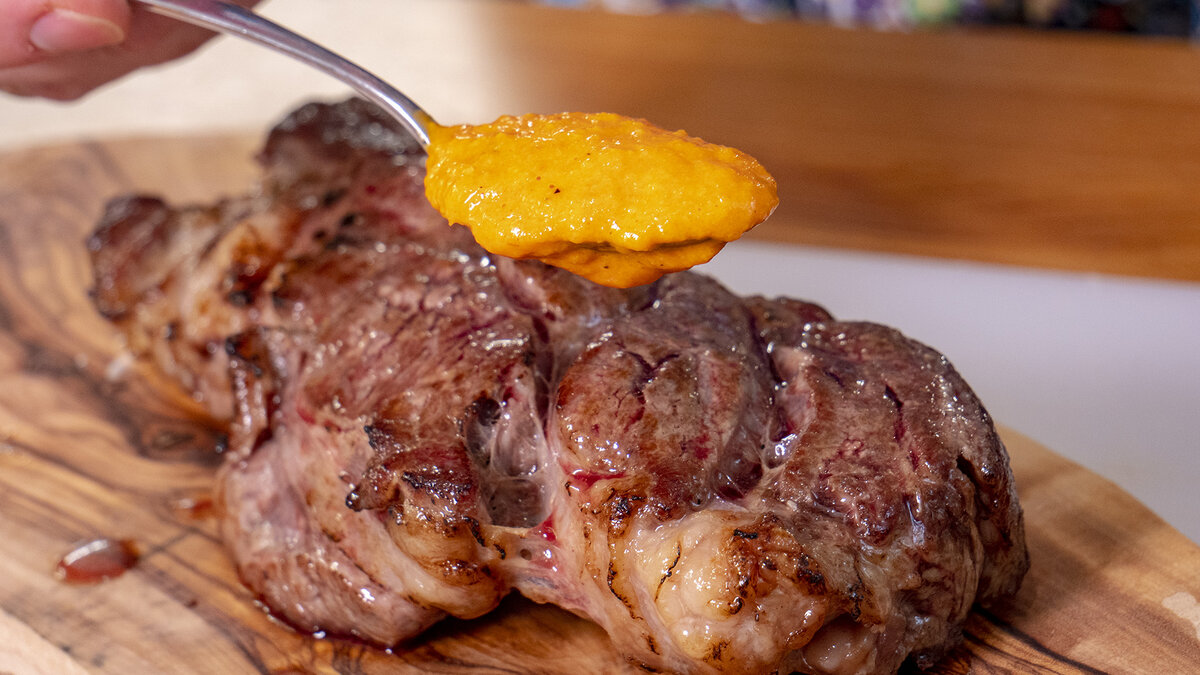 Теперь за дело берёмся с мясом. Говядина должна полежать в комнатной температуре не менее полутора часов. Смазав ее растительным маслом, выкладывайте на нагретую сковороду без добавления масла, чтобы сохранить вкус. В процессе жарки можно чуть обжечь мясо горелкой, что придаст дополнительные ароматы. Перевернув мясо, дождитесь, пока из него выделится сок, и это поможет создать аппетитную корочку.