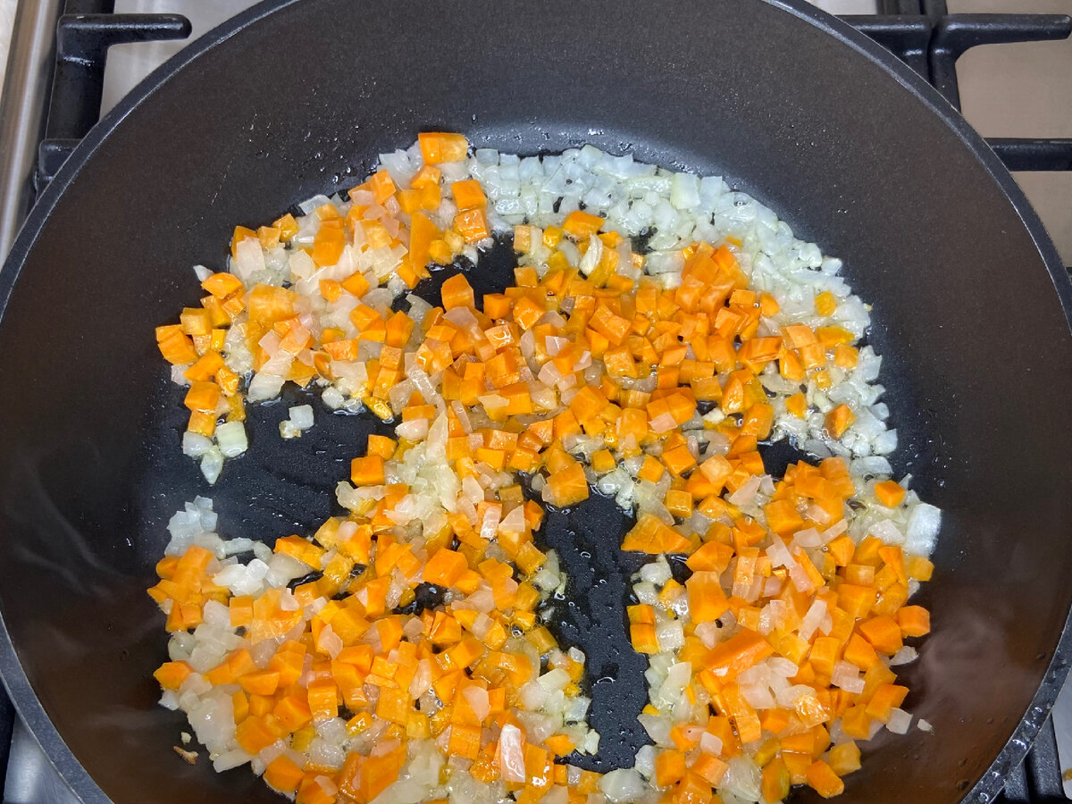 Лук и морковь тоже нарезаются мелкими кусочками. Затем овощи обжариваются на сковороде с небольшим количеством растительного масла до мягкости. Чтобы добавить яркий вкус, в эту смесь стоит добавить и болгарский перец — он придаёт супу невероятный аромат. Как только овощи готовы, их можно снимать с огня и дожидаться, пока сварится картофель.
