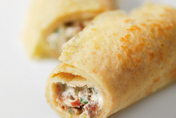 4. Как только блинчики готовы, намазать их приготовленной пастой из творожного сыра и инжира, свернуть в трубочки или сложить любым желаемым образом, и подать горячими.