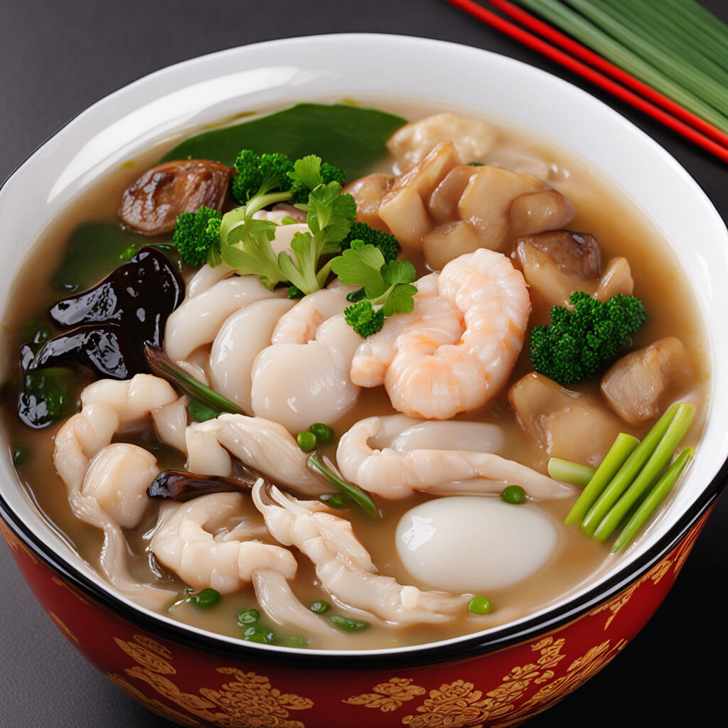 Приготовление заключается в том, чтобы отварить мясо до готовности, добавить морепродукты и грибы, затем сбалансировать вкус с помощью соевого соуса и специй.
