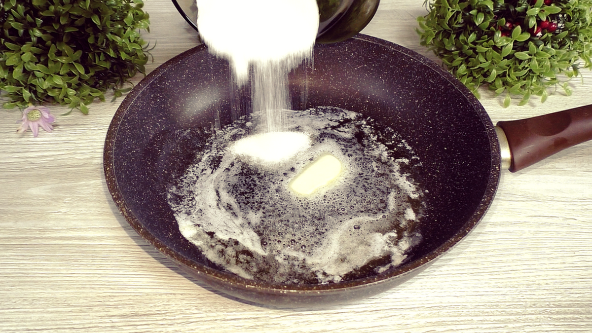 В сковороде следует растопить сливочное масло. Затем яблоки, промытые и нарезанные на средние кусочки (кожура необязательна), добавляются в сковороду. Важно оставить половину сахара для добавления в конце. Яблоки готовятся на огне чуть выше среднего около 7 минут, их стоит осторожно помешивать. Чтобы проверить готовность, достаточно попробовать кусочек: яблоки должны стать мягкими, но не распадаться. Если они очень сочные, лучше избавиться от лишней влаги, увеличив огонь.