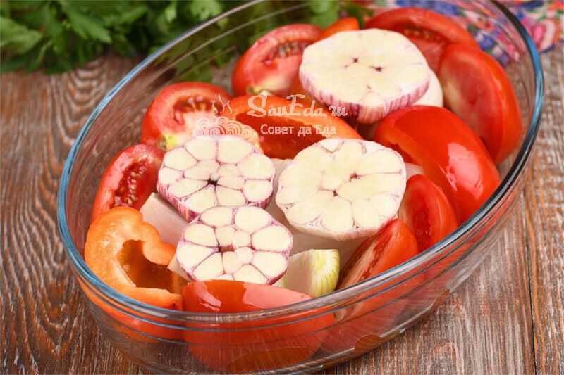 Итак, для начала возьмем 5 средних помидоров, 2 луковицы и 1 большой сладкий перец. Нарезать овощи следует крупными кусками. Головки чеснока предварительно разрезаем пополам. Готовые овощи аккуратно выкладываем в форму, поливаем 2-3 столовыми ложками растительного масла и отправляем в разогретую до 180 градусов духовку на 45-50 минут.