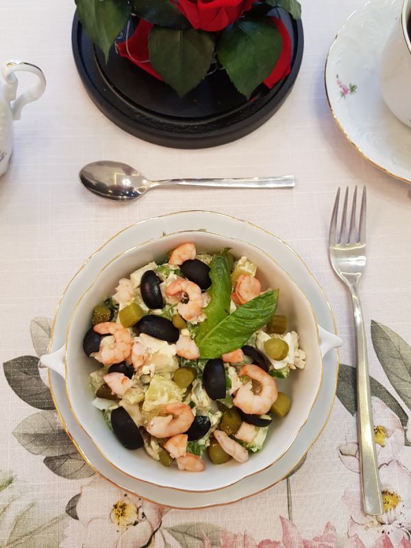 Готовый салат раскладывают по тарелкам, украшают листьями салата, маслинами, креветками и пикулями, придавая блюду праздничный вид. Этот салат не только привлекает своим вкусом, но и радует ярким оформлением.