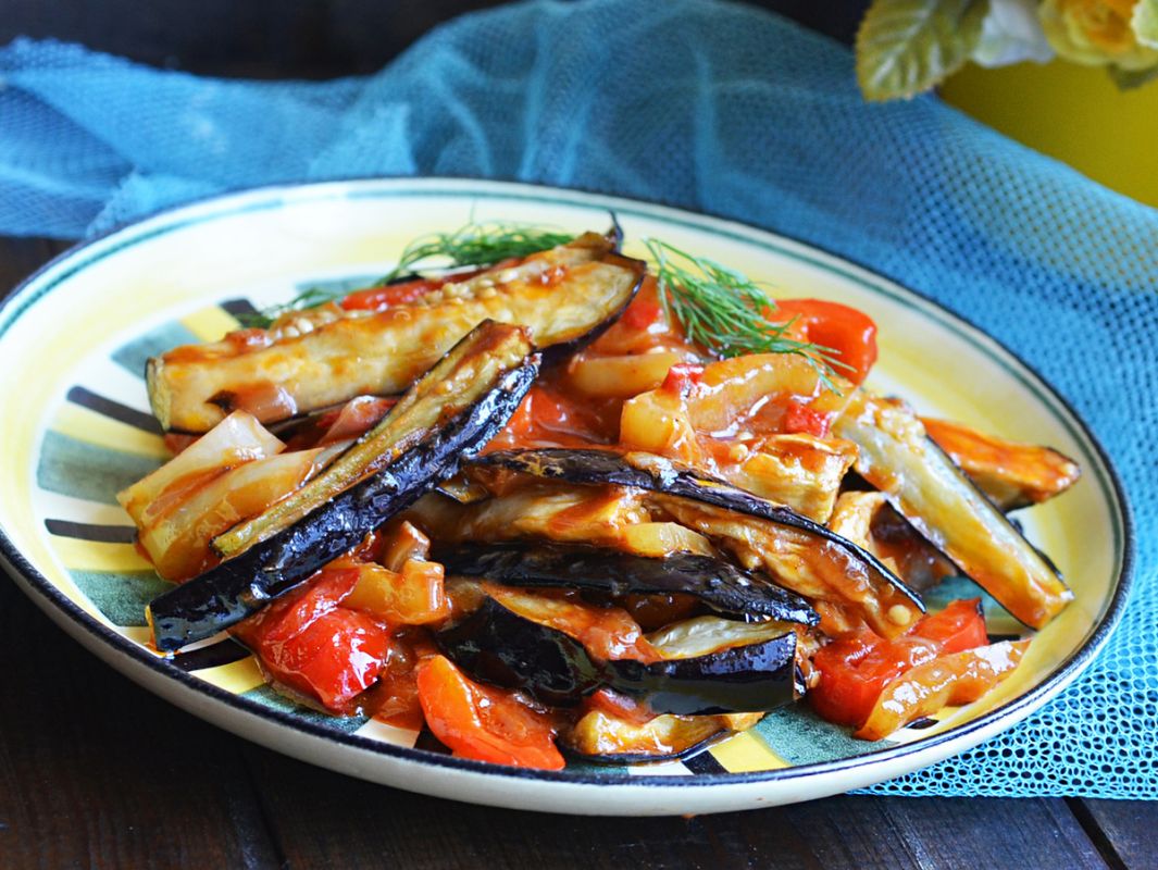 Пока баклажаны отдают влагу, нарезают 2 болгарских перца (желательно разных цветов для яркости) соломкой или квадратиками и 1 луковицу полукольцами. Обязательно добавить 5 зубчиков чеснока и чили по вкусу. Шинкуем овощи не слишком мелко, так как они пойдут в соус.