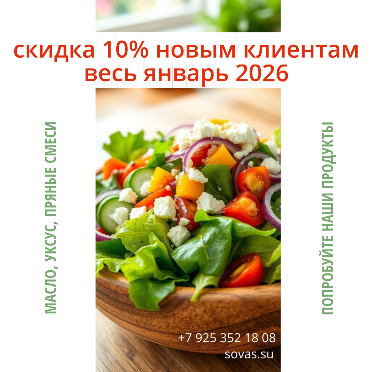 Весь январь 2026 года новые клиенты могут воспользоваться эксклюзивной скидкой 10% на всю нашу продукцию. Пробуйте наши масла и уксусы, создавайте вкусные и полезные салаты и разнообразьте ваше меню.