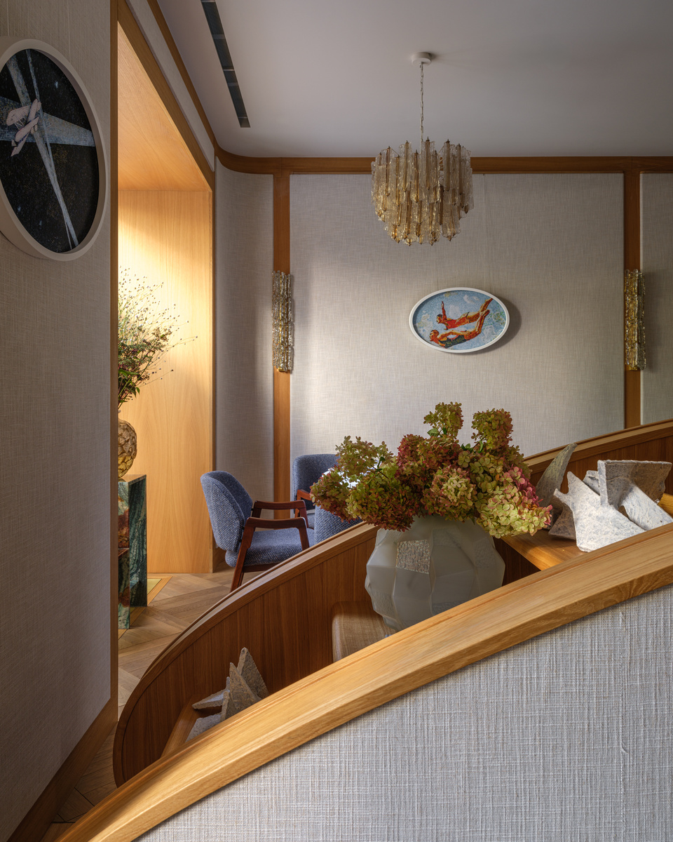 Особая гордость — лестница, разработанная специально для Leo, а также уникальные предметы интерьера, включая винтажные стулья Ико Паризи и французские антикварные вазы Ren? Lalique. Все это создает ощущение не просто зала для трапезы, а домашнего уюта, где разговоры о высоком остаются на первом плане.