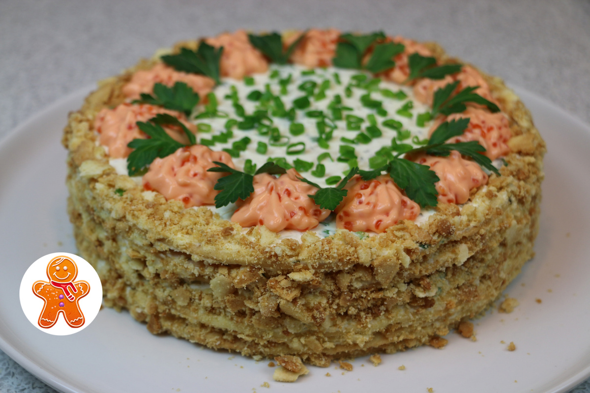 Представляем вашему вниманию «Наполеон» — замечательный закусочный торт, идеально подходящий для любого торжества. Эта кулинарная изысканность, украшенная нежной красной рыбой, станет настоящим украшением вашего стола. Приготовление не займет много времени, а результат приятно удивит!