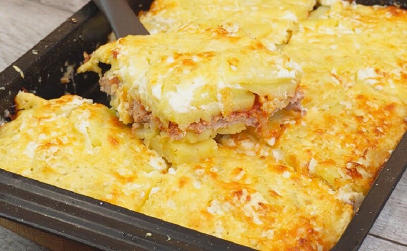 Форму для запекания смазывают маслом и укладывают первый слой из картофеля. Затем равномерно распределяют мясную начинку и вновь укладывают слой картофеля. Накрывают форму фольгой и ставят в духовку на 45 минут при 180 градусах. После этого фольгу снимают, сверху посыпают тертым сыром и запекают еще 15-20 минут.