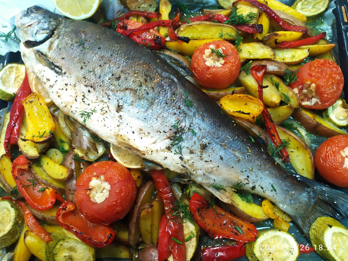 - Запеченный карп с овощами,