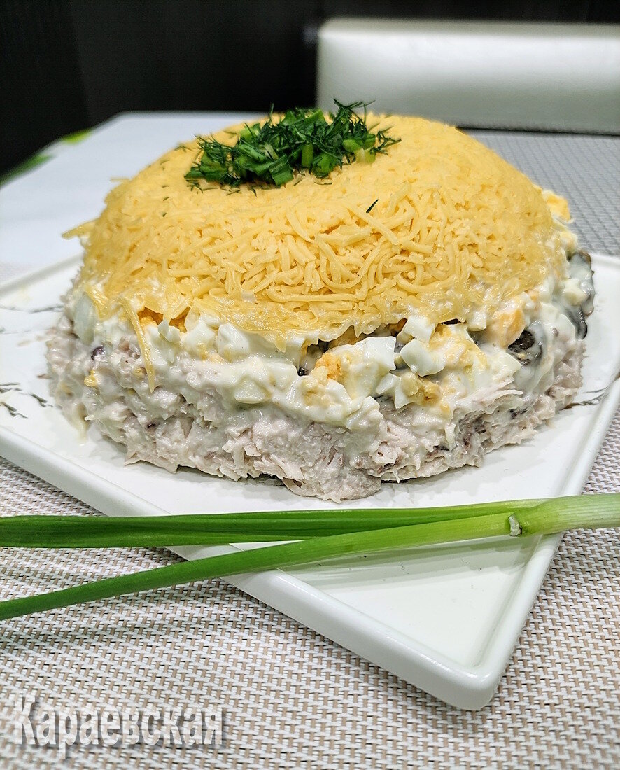 Теперь можно приступать к сбору салата! Если вы используете глубокую миску, первым слоем будет тертый сыр. Утрамбуйте его и смажьте майонезом. Затем добавьте грибы с луком, следующий слой — яйца и завершающий — куриное мясо, тоже с майонезом. Все плотненько прижмите, накройте подходящим блюдом и переверните. Аккуратно снимите миску и украсьте зеленью.