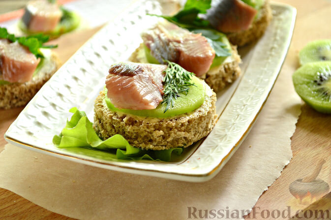 Для более смелых сочетаний подойдут канапе с сельдью и киви, которые удивят своей необычностью и ярким вкусом.
