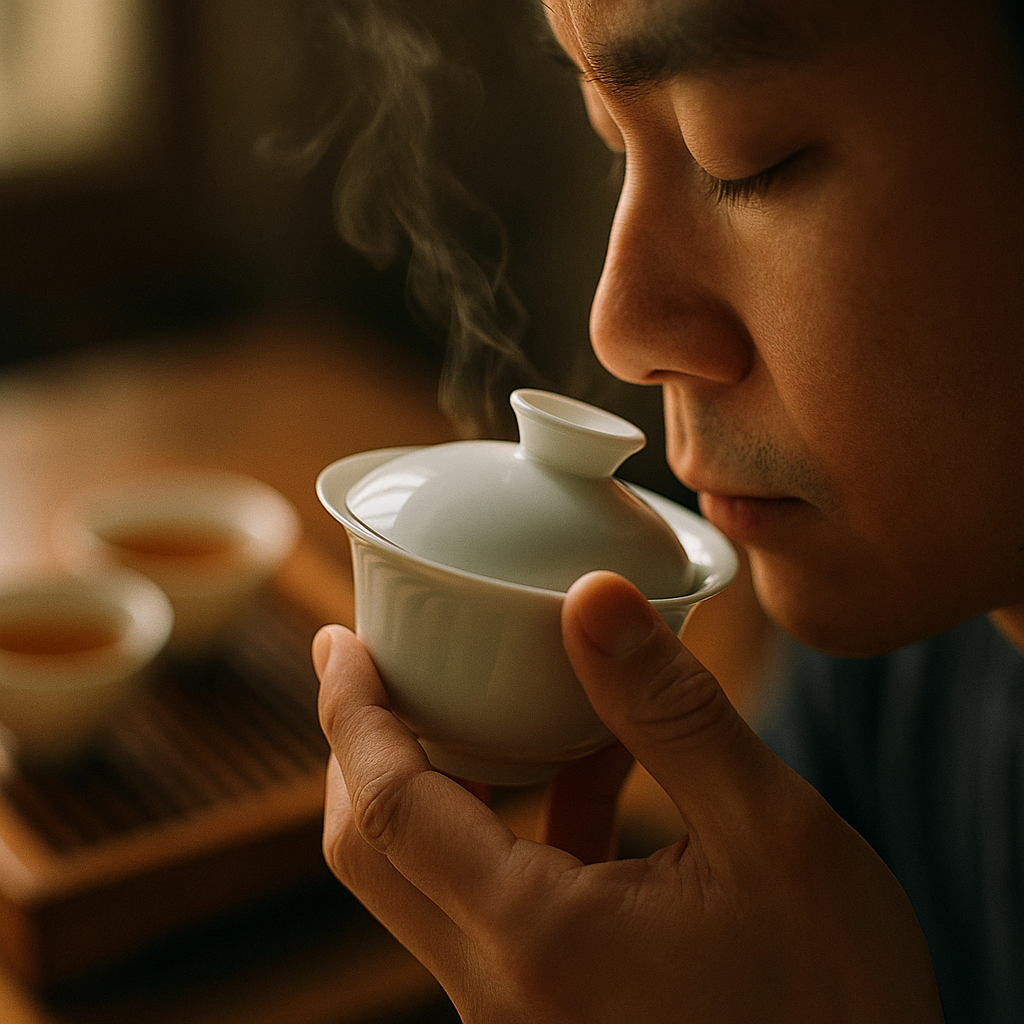 Поднесите гайвань к лицу и аккуратно вдохните пар — это самый чистый аромат, он отражает душу чайного листа. В чайной культуре это называют: «Пар — дыхание листа».