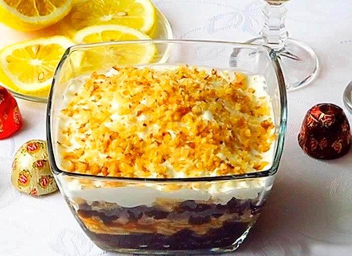 9. Полейте взбитой сметаной слои салата и посыпьте орехами.