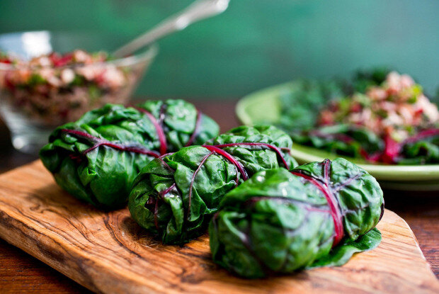 Первым делом подготовьте листья. Промойте их, отрежьте жесткие стебли и поместите в кастрюлю с кипятком на 5 минут. После этого аккуратно достаньте листья и дайте им остыть.В глубокой миске смешайте фарш с мелко нарезанным луком, промытым рисом и натертой морковью. Добавьте соль, перец и свежую зелень по вкусу, тщательно перемешайте все ингредиенты.Теперь пора готовить голубцы. На каждый листик кладите немного фарша, сворачивайте их, аккуратно закручивая края, чтобы начинка не вытекла.На сковороде обжарьте натертую морковь и нарезанный лук, добавляя нарезанный помидор и томатную пасту. Обжаривайте до легкого золотистого цвета, затем добавьте немного воды для соуса. Выложите голубцы и убедитесь, что они покрыты жидкостью. Накройте крышкой и тушите на медленном огне около 40 минут.После этого выключите огонь и дайте голубцам настояться под полотенцем еще около 30 минут.Пора наслаждаться вкусом этих уникальных голубцов! Они приятно удивят всех ваших близких. Приготовьте их и поделитесь с друзьями!