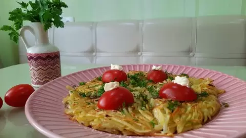 2. Половину натертого картофеля выложите на заранее разогретую и смазанную маслом сковороду. Затем разместите слой тертого сыра и накройте оставшимся картофелем. Закройте крышкой и готовьте на среднем огне по 3-4 минуты с каждой стороны.