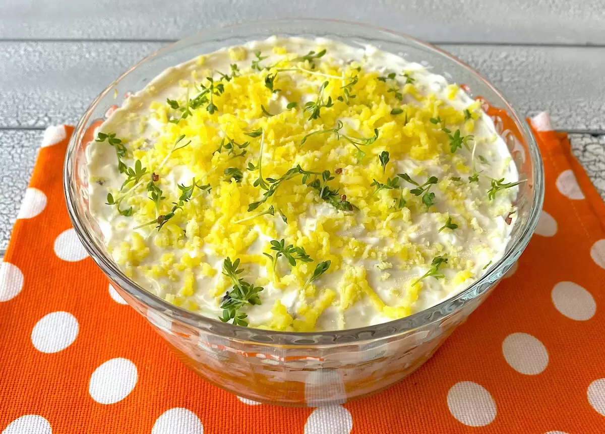 Салат «Галинка» готов к подаче. Его можно подавать как на повседневный обед, так и на праздничный стол. Приятного аппетита!