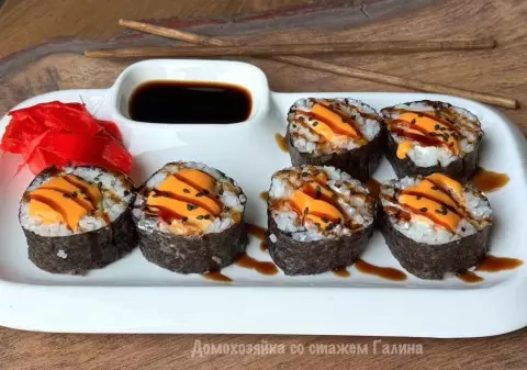 Когда рис остыл, на бамбуковый коврик укладывается лист нори шершавой стороной вверх. Рис равномерно распределяется по поверхности, оставляя край без начинки. Далее следует нарезанный кальмар, дольки авокадо и немного творожного сыра, который можно отсадить при помощи кулинарного мешка. Свободный край нори необходимо слегка смочить водой, чтобы удобно свернуть рулет. После этого роллы нарезаются на порции и выкладываются на сервировочное блюдо. Для завершения угощения можно добавить соусы - спайси и унаги, а также подать с соевым соусом и маринованным имбирем.