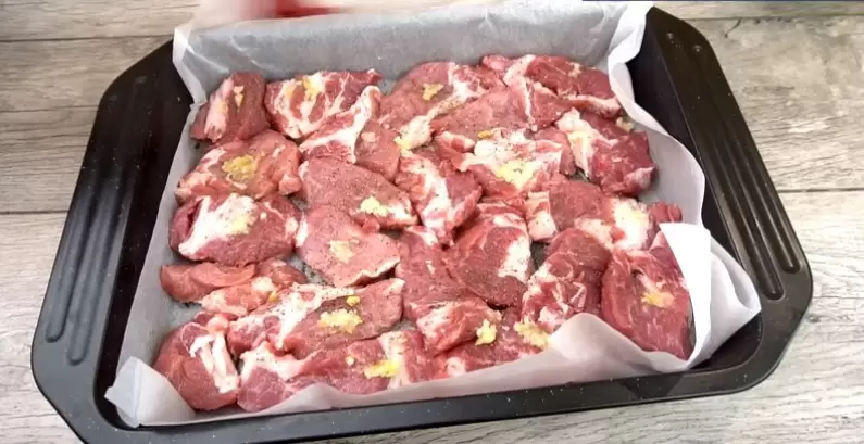 Для начала, мясо (оптимально подходит свиная шея) нарезается на порционные кусочки размером примерно 3 на 4 см. Затем следует подготовить бумагу для выпечки: отрезать её так, чтобы хватило на два слоя для застилания противня. Первый слой бумаги смазываем растительным маслом и выкладываем подготовленное мясо.