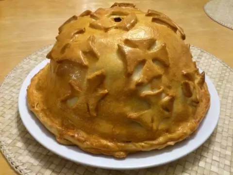Такой пирог отличается от простого закрытого. Начинка делится на слои, которые отделяются блинчиками. После этого курник закрывается вторым слоем теста, в центре оставляя отверстие для выхода пара. Для придания пирогу праздничного вида его дополнительно украшают фигурками из теста.