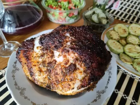 Кусок мяса помещают в глубокую миску и обильно заливают маринадом. Длинным ножом устанавливаются проколы, в которые втыкаются разрезанные вдоль зубчики чеснока. Мясо должно быть равномерно покрыто маринадом. Закрывают крышкой или пленкой и ставят в холодильник на сутки, не забывая несколько раз перевернуть его.