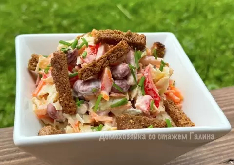 Этот салат с фасолью и карбонадом станет настоящим украшением любого стола. Он не только порадует своим вкусом, но и удивит гостей яркими красками и аппетитным видом. Рецепт можно адаптировать, заменив карбонад, например, на крабовые палочки или вареную говядину — каждый вариант заслуживает внимания.